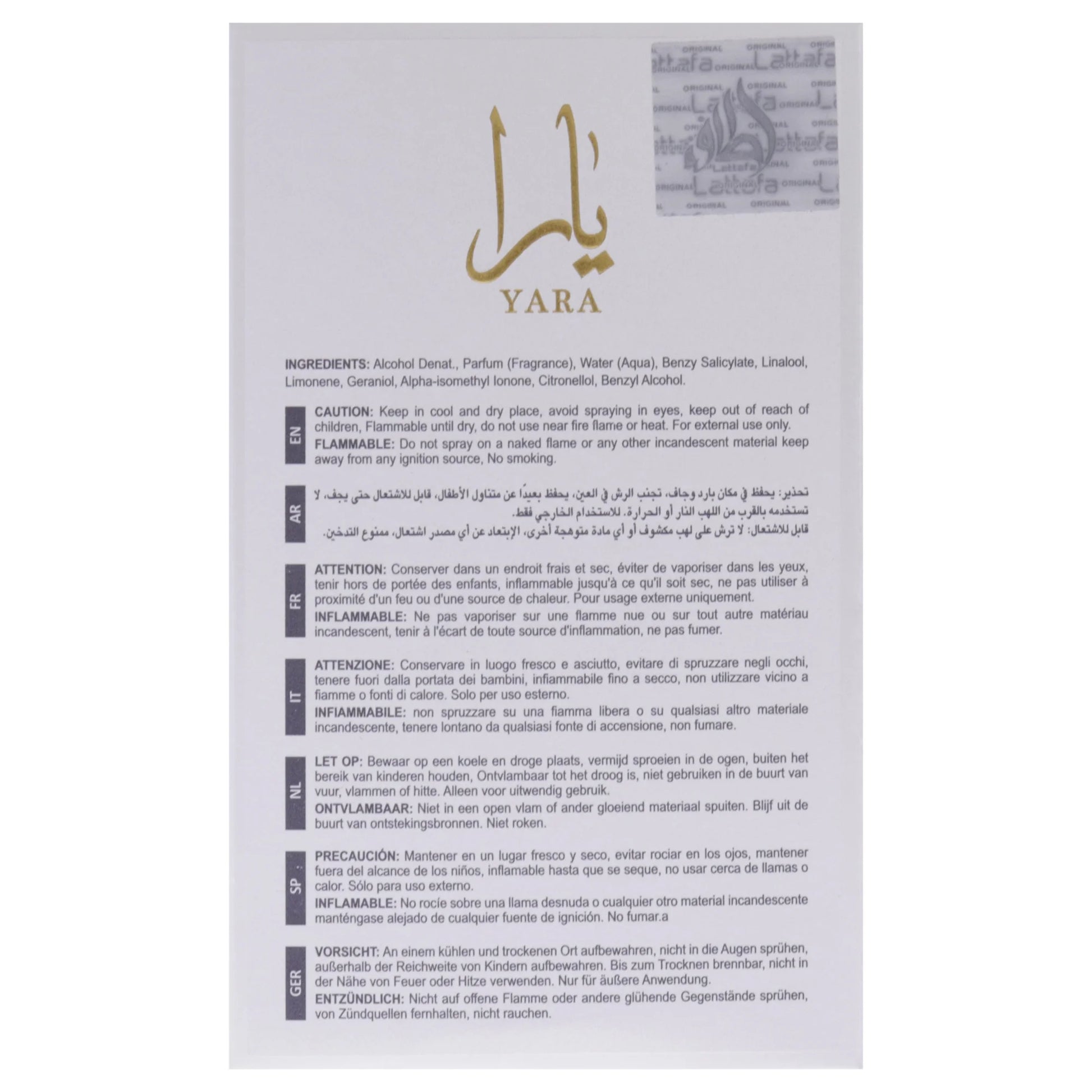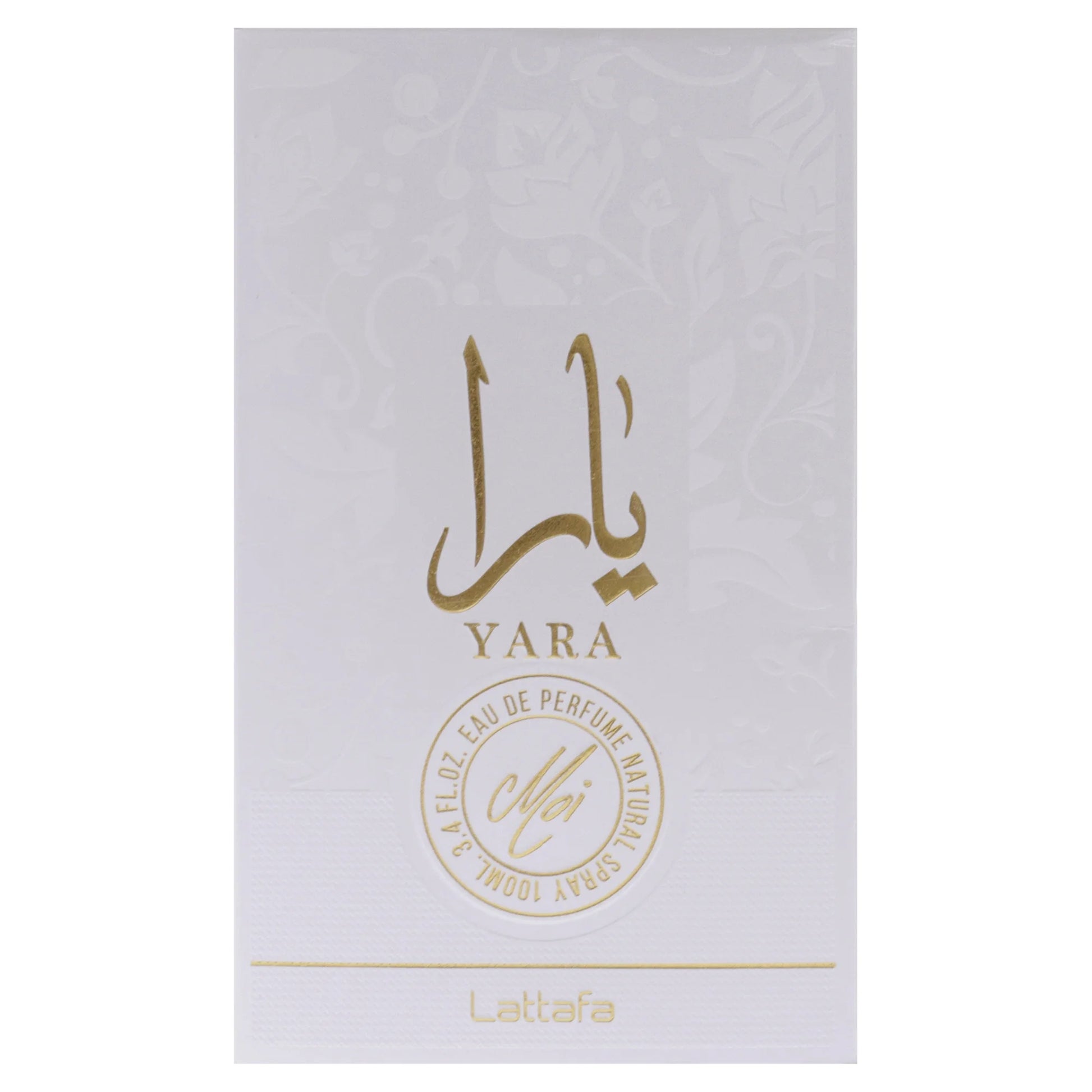 Lattafa Yara Moi Eau de Parfum Spray (3.4 oz / 100 ml) is a fragrance by Lattafa Perfumes, also known as "White Yara." It was launched in 2022 and is described as a mesmerizing blend of elegance and sensuality.